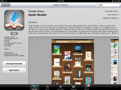 據悉,方正集團旗下知名數字出版技術(shù)公司——方正阿帕比,最新發(fā)布了其明星產(chǎn)品——電子書(shū)閱讀軟件Apabi Reader針對iPad開(kāi)發(fā)的版本。據了解,這款 Apabi Reader for iPad  v1.0.1是國內首款正式登陸iPad的專(zhuān)業(yè)電子書(shū)閱讀軟件。