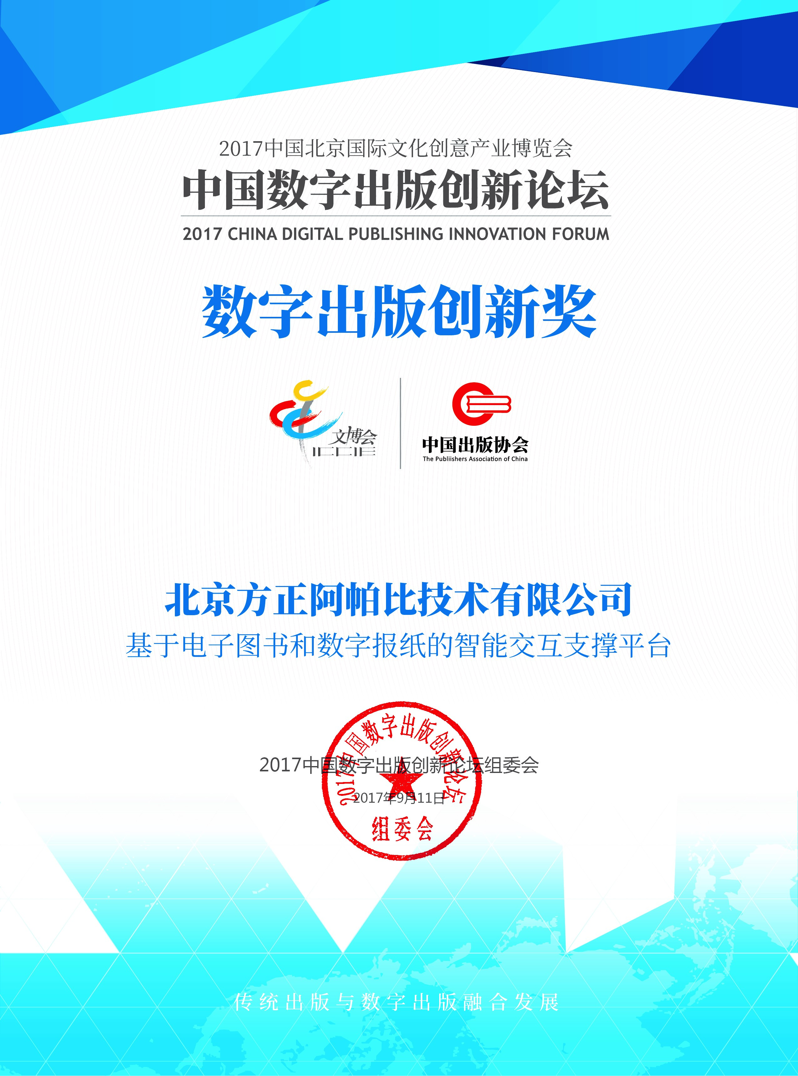 方正阿帕比技術(shù)有限公司作為中國出版協(xié)會(huì )、中國音像與數字出版協(xié)會(huì )成員單位受邀參加論壇,并在2017中國數字出版創(chuàng )新論壇“出版融合創(chuàng )新獎”評選中,獲得“最佳數字出版智能交互平臺獎”。