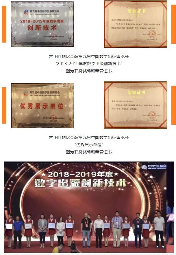 方正阿帕比榮獲第九屆中國數字出版博覽會(huì )“2018-2019 年度數字出版創(chuàng )新技術(shù)”圖為獲獎獎牌和榮譽(yù)證書(shū)